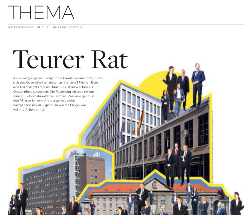 Ein Teil der Antworten ist, dass es der Bundesregierung inzwischen zur Gewohnheit geworden ist, externe Beratung zu beanspruchen. Berater gehen in Ministerien und Behörden seit Jahren ein und aus. Allein die Bundesministerien und das Kanzleramt gaben einer aktuellen Auskunft der Regierung zufolge im ersten Dreivierteljahr 2020 rund 344 Millionen Euro für externe Berater aus. Rechnet man die Ausgaben aller öffentlichen Behörden von Bund, Ländern und Kommunen zusammen, kamen einer Hochrechnung von Forschern der Hochschule Bonn-Rhein-Sieg zufolge sogar mehr als drei Milliarden Euro an Beraterausgaben zusammen.
